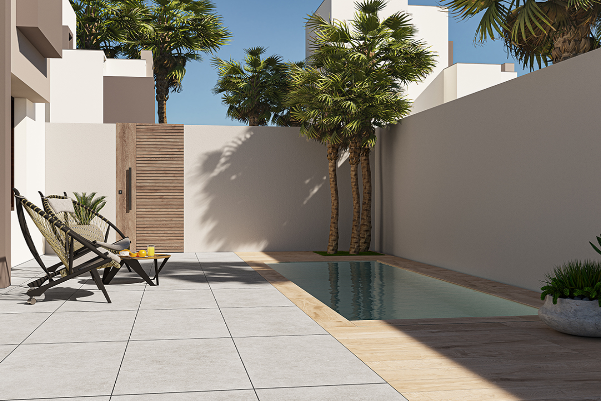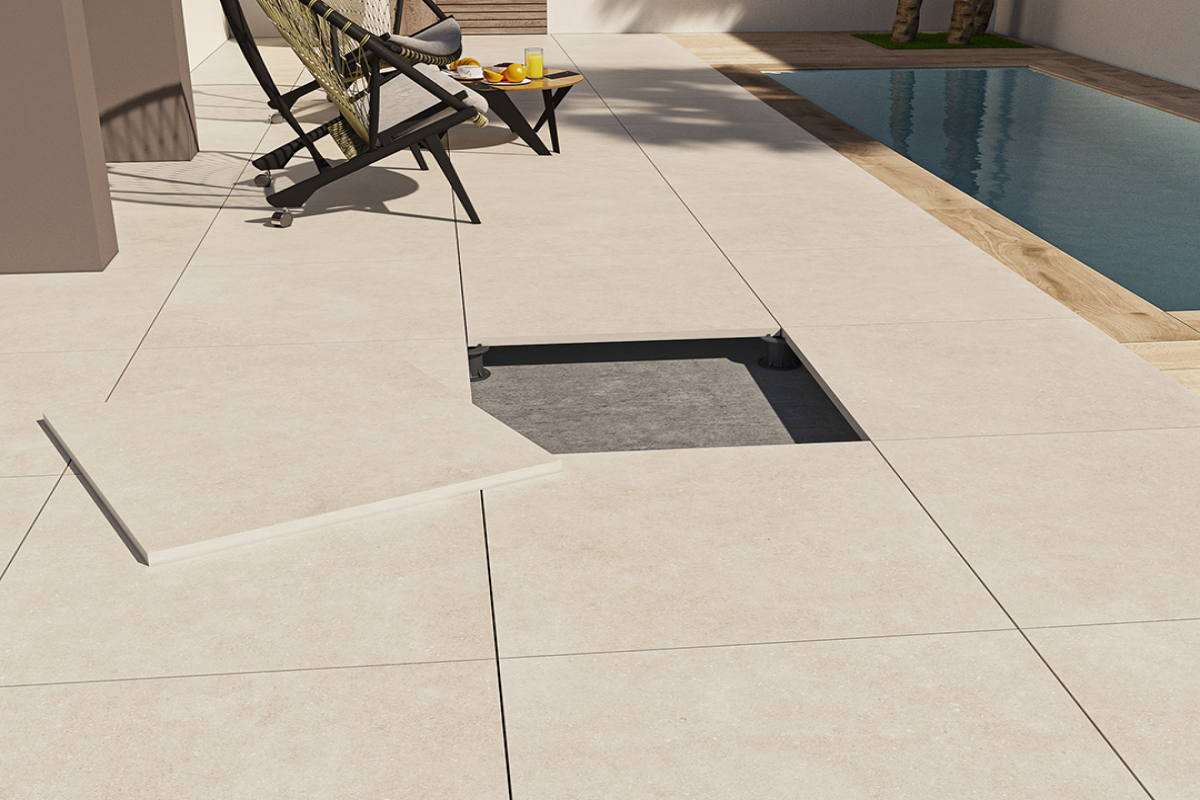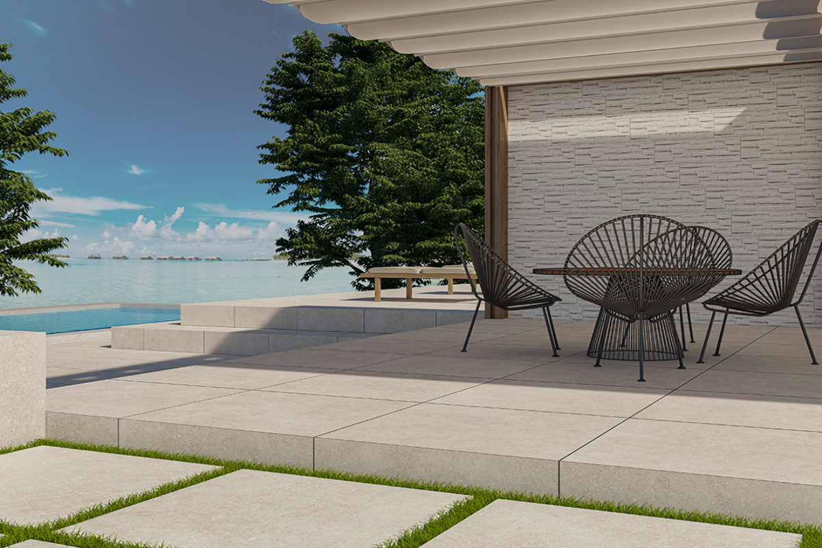- 20 mm-es emelt vastagságú porcelán: fejlett szerkezeti megoldás nagy terhelésnek és szélsőséges időjárásnak kitett kültéri terekhez felhasználási korlátok nélkül.