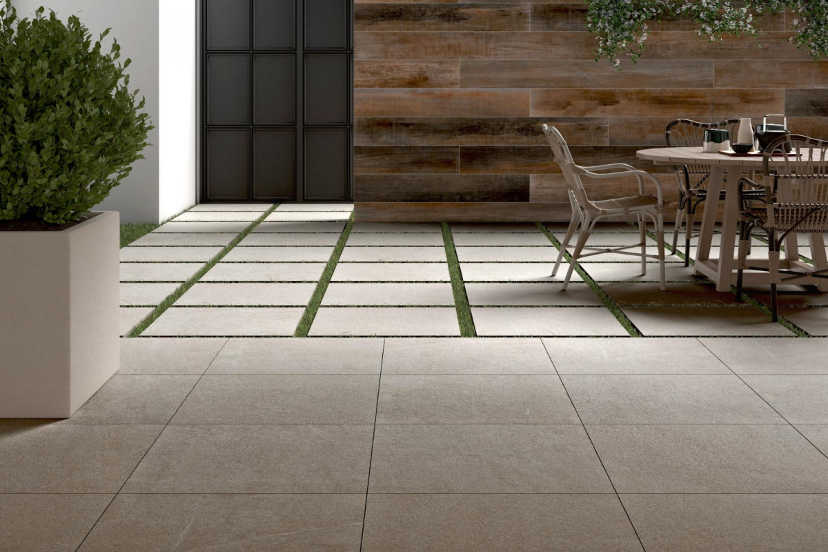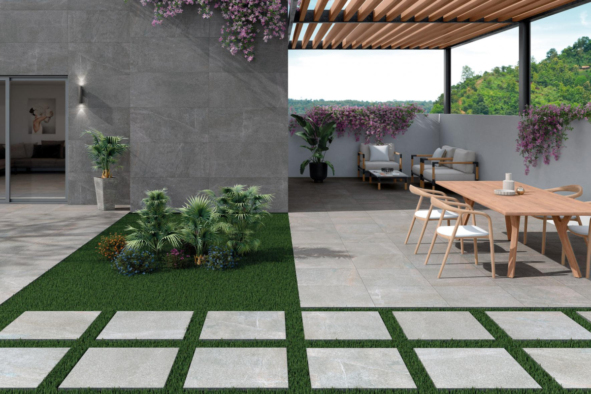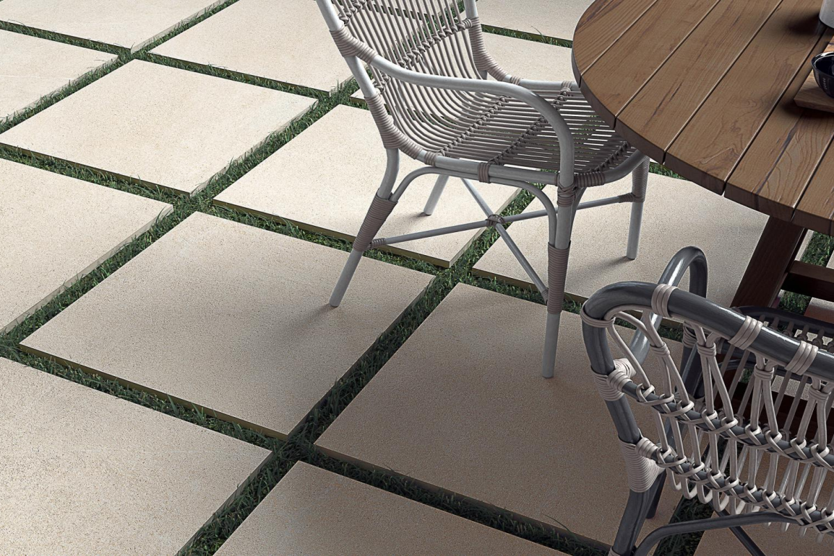 - 20 mm-es emelt vastagságú porcelán: fejlett szerkezeti megoldás nagy terhelésnek és szélsőséges időjárásnak kitett kültéri terekhez felhasználási korlátok nélkül.